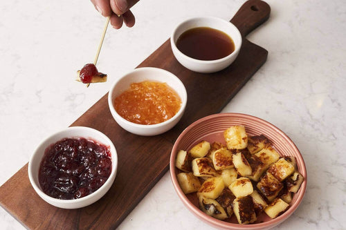 - Once done, remove the cheese from the pan and cut it into 1-inch squares. (Be careful, the cheese will be hot)