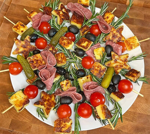 - While the cheese is warm, thread the cooked cheese and other antipasto ingredients onto large toothpicks. Arrange the skewers in a wreath shape on a large round platter or serving board.