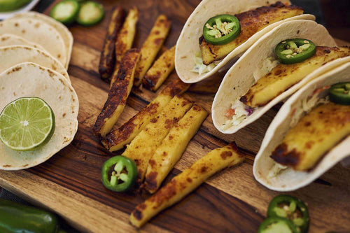 - To assemble the tacos, fill the warm tortillas coleslaw, strips of The Big Moo and a few slices of jalapeño.