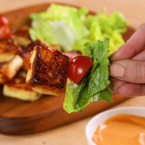 - To assemble, skewer a piece of romaine lettuce, a cherry tomato half, and a cube of the cooked cheese onto a toothpick.