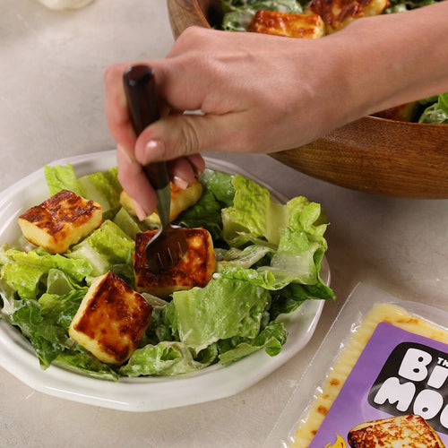 - Assemble your salad by tossing the Romain with Caesar salad dressing. Top with the toasty Big Moo Cheese.