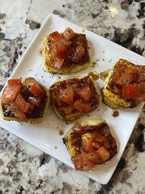 - Top the toasted baguettes with the cheese and the bruschetta mix, or leave the toast out and just have the bruschetta on The Big Moo squares.