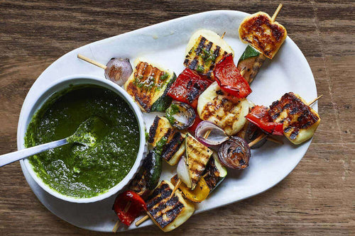 - Brush the skewers lightly with oil and season all over with salt and pepper to taste. Grill each skewer for nearly 20 minutes, rotating the skewers every 3-4 minutes to ensure even cooking on all sides. The vegetables should be slightly charred and tender, the cheese will be soft and melted.