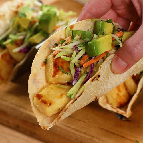 - To assemble the tacos, fill the warm tortillas with strips of The Big Moo, coleslaw mix, and top with slices of avocado.