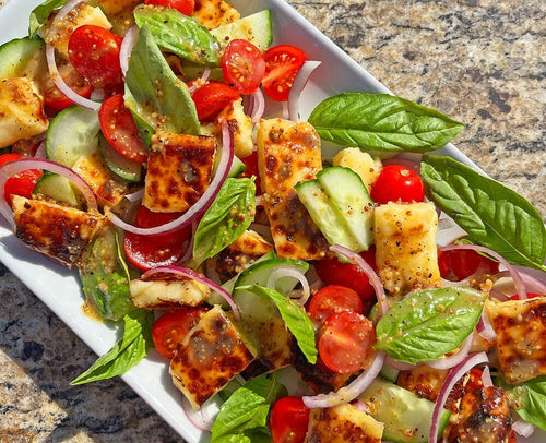 - Assemble the salad with the sliced cucumbers, tomatoes, baked cheese, red onions, and drizzle with dressing. Top with fresh basil and sprinkle with flaky sea salt.