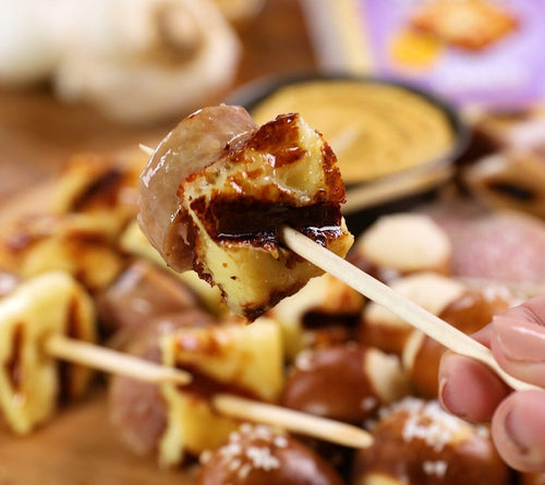 Arrange the assembled skewers on a serving platter. Optionally, serve with mustard and soft pretzel bites on the side.