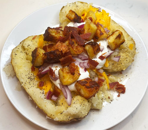 - Once the potatoes have finished baking, slice open each potato, fluff the insides, and serve with desired toppings including The Big Moo.