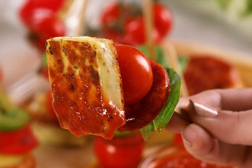- Once The Big Moo is cooked, it's time to assemble! Layer one piece of cooked cheese with a cherry tomato, pepperoni slice, and basil leaf. Then, skewer with a toothpick.
